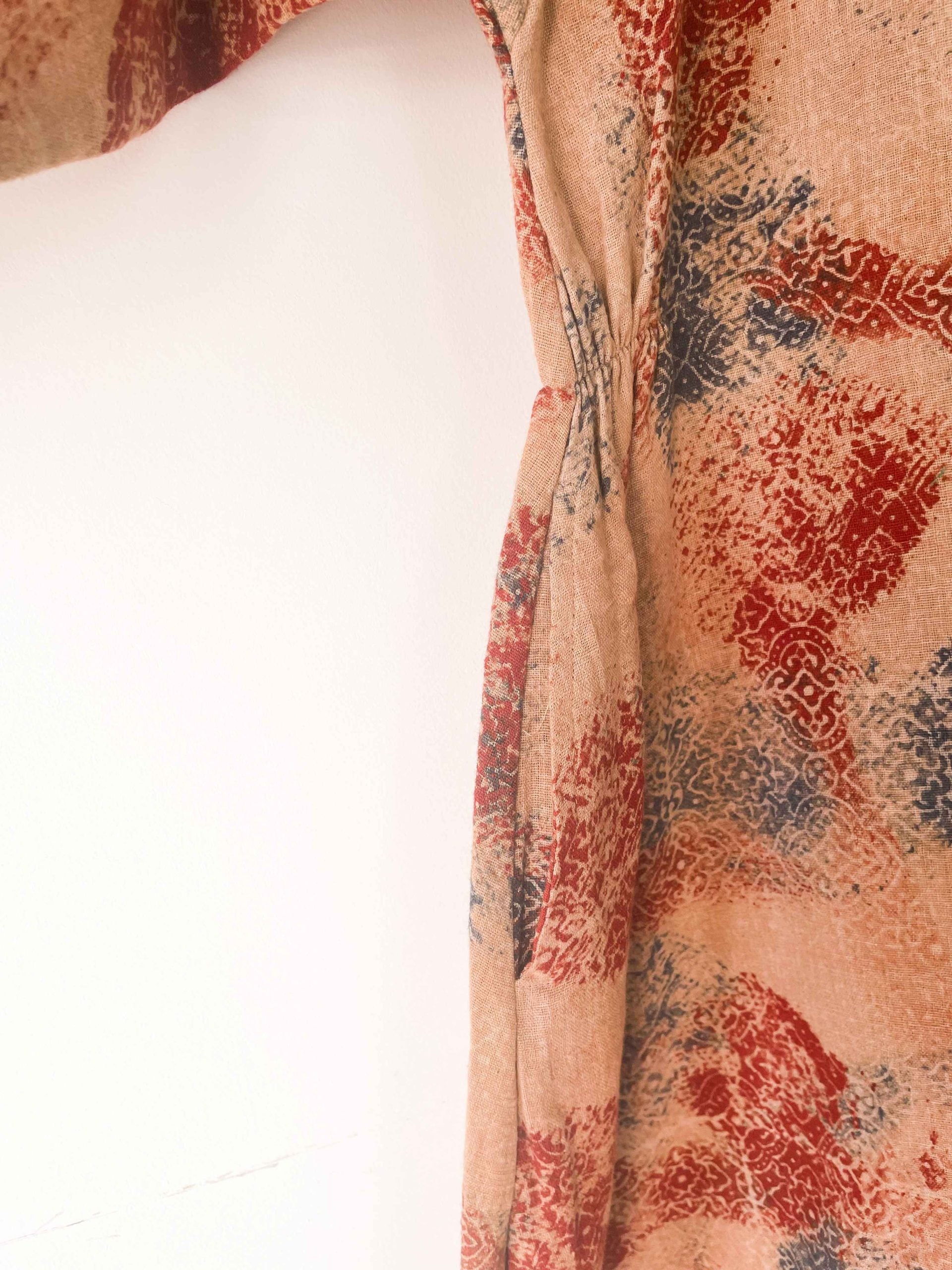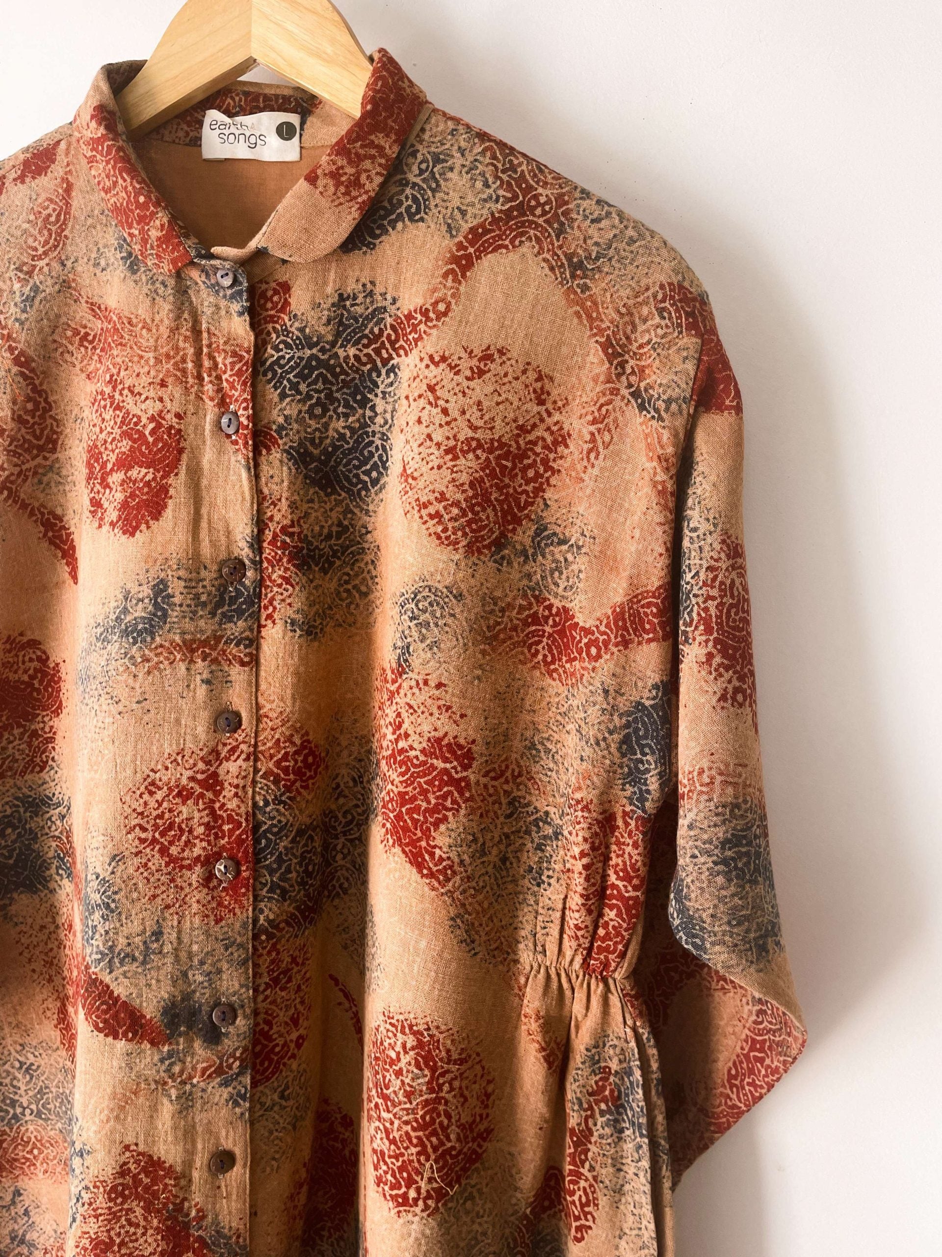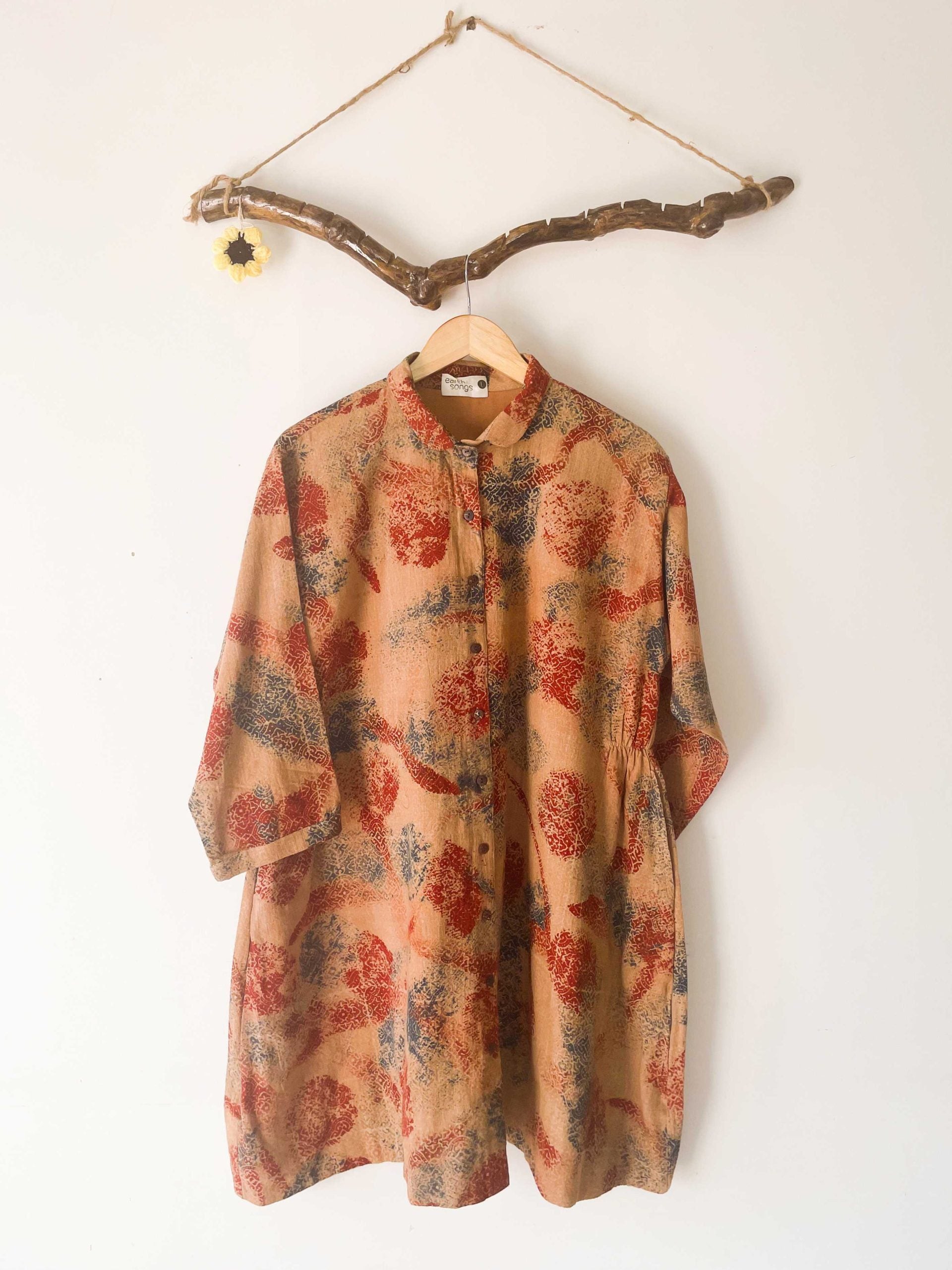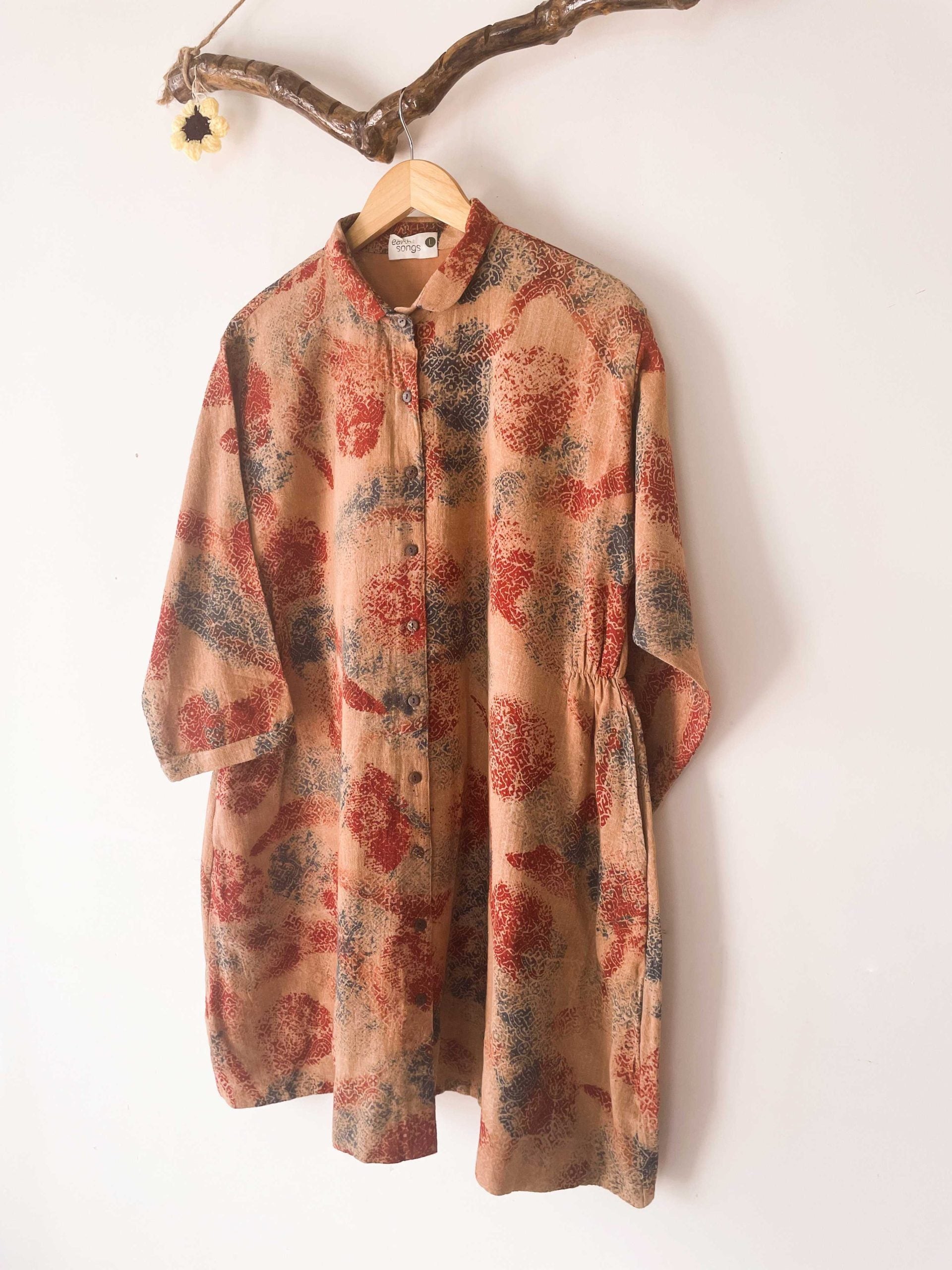 Step into a realm of timeless elegance with our exquisite garment, a tribute to the handmade artistry that celebrates Indian heritage. Crafted for the modern Indian woman, this piece marries comfort with simple sophistication. Imagine the gentle touch of hand-spun fabric, adorned with traditional Ajrakh block prints, enveloping you in unparalleled grace. With long sleeves and a delicately rounded collar, this knee-length masterpiece features a front button-down design, offering a versatile silhouette. Hidden contrast pockets add a playful surprise, while a defined waist enhances your natural elegance. Embrace sophistication redefined.